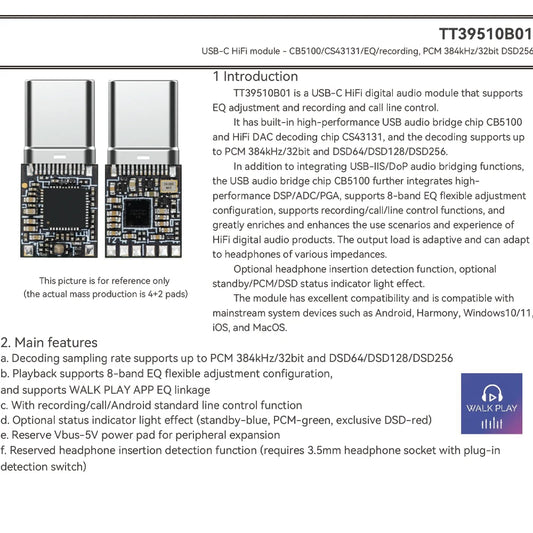 USB-C HiFi Digital Audio Module Amp Dongle Headphone DAC Sound amplifier CB5100 & CS43131 Chips, 384kHz/32bit DSD256